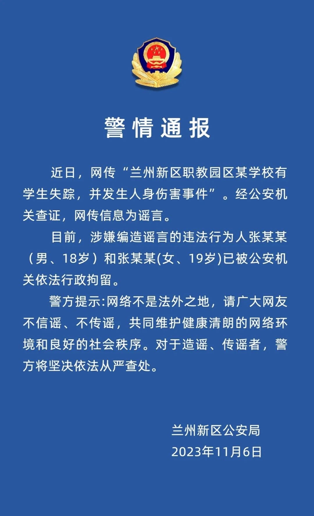 ·蘭州新區(qū)警方:“某學(xué)校學(xué)生失蹤”為謠言,兩名造謠者被行拘。