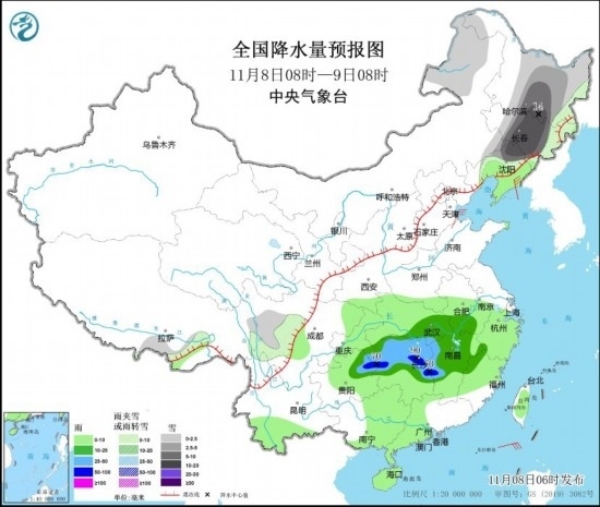 中新網(wǎng)11月8日電 據(jù)中央氣象臺網(wǎng)站消息,預(yù)計8日至9日,黑龍江中南部、吉林中西部、遼寧北部等地有暴雪和低溫冰凍災(zāi)害風(fēng)險,關(guān)注對交通運(yùn)輸、建筑設(shè)施安全、農(nóng)牧業(yè)、電力通信等的影響;湖南、江西、浙江、福建等地降雨較強(qiáng),注意防范次生災(zāi)害。