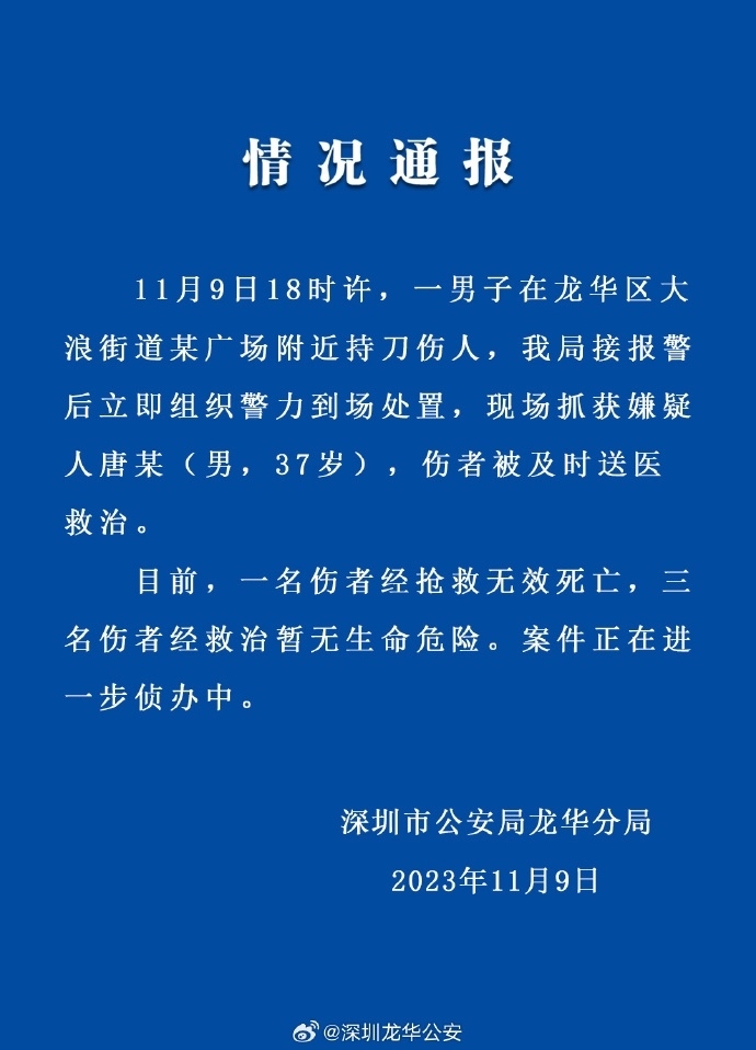 ·深圳警方:一男子在廣場持刀傷人致1死3傷,嫌犯已被捕。