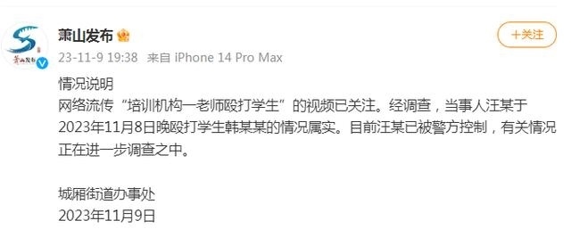 ·杭州蕭山通報“培訓機構(gòu)一老師毆打?qū)W生”:屬實,打人者已被警方控制。