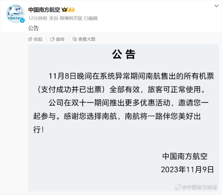 ·系統(tǒng)故障出現(xiàn)10元低價機票,南航回應:出票成功可正常出行。