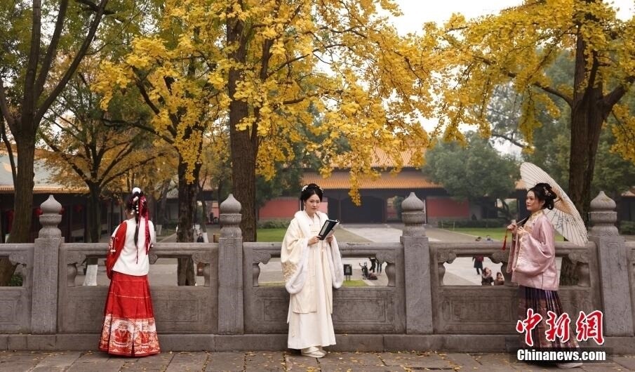 近日,南京朝天宮內(nèi)的古銀杏披上“金甲”,與古樸的建筑相映襯,增添了一份“詩情畫意”。圖為民眾在古銀杏樹下拍攝照片。