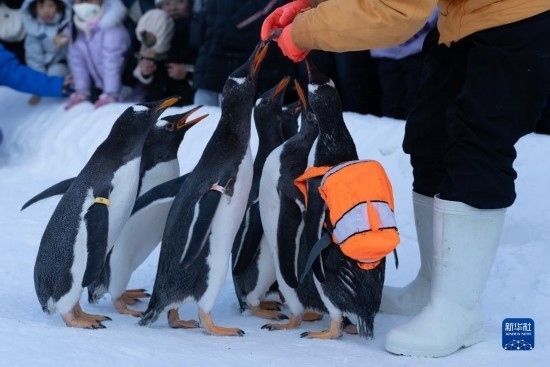 時(shí)值周末,哈爾濱極地公園的企鵝亮相戶外,上演冰雪巡游,吸引許多游客前來觀賞。目前正是黑龍江省哈爾濱市的冰雪旅游季。