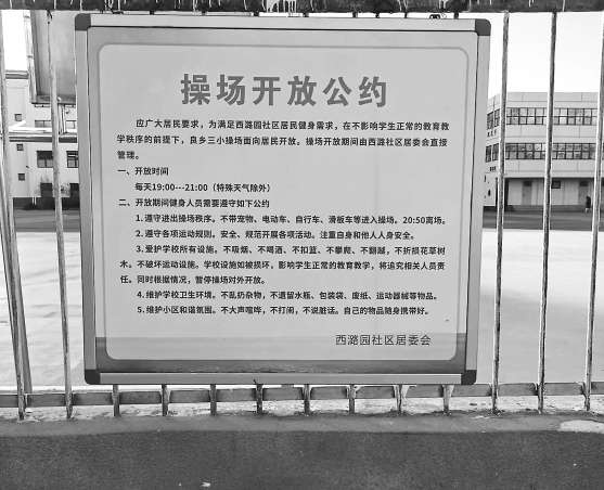 這么多人,如果光靠社區(qū)單方面管理,可能還是會(huì)有顧及不到的地方?!拔覀兒途用窆餐套h,制定了一份‘操場(chǎng)開(kāi)放公約’,全體入內(nèi)活動(dòng)的居民都有義務(wù)遵守?!?/p>