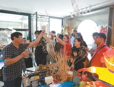顧業(yè)亮(左一)向游客介紹展示秦淮燈彩制作。圖為南京歷史城區(qū)保護(hù)建設(shè)集團(tuán)有限公司提供