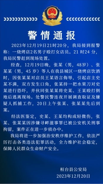 ·淄博一燒烤店2名男子毆打女店員,警方通報:涉事者已被刑拘。