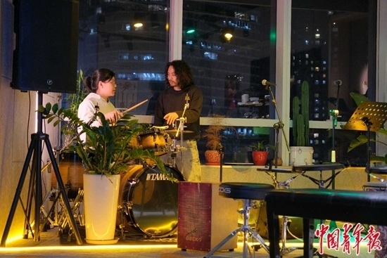 12月4日,北京市朝陽區(qū)望京的一處寫字樓里,夜校老師、樂隊(duì)鼓手老萬(右)在為一名學(xué)員講授架子鼓課程,她是一名零基礎(chǔ)學(xué)員。中青報(bào)·中青網(wǎng)見習(xí)記者 田嘉碩/攝