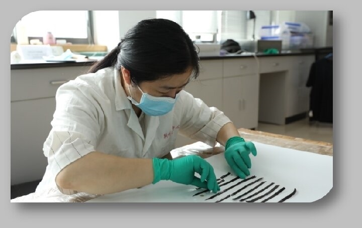 荊州文保中心工作人員在對出土楚簡進行排序。荊州博物館供圖