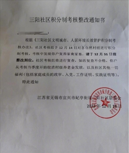 ·江蘇宜興一社區(qū)禁止養(yǎng)家禽,不整改將取消村級(jí)養(yǎng)老金、工作證明、入黨等福利,官方回應(yīng):撤銷通知書、廢止考核,調(diào)查處理責(zé)任人。