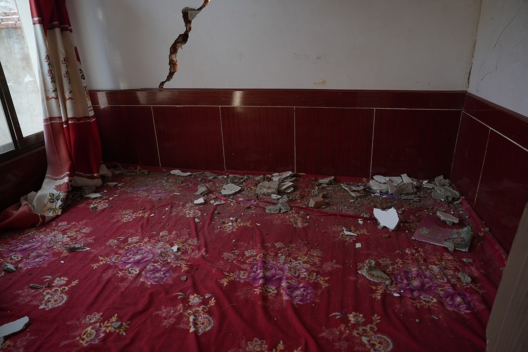 12月23日當(dāng)天,馬國忠和叔叔伯伯兩家都在家門前搭起剛領(lǐng)的帳篷。叔叔馬進(jìn)明家受損嚴(yán)重,兩堵磚墻的銜接處完全開裂,像條拉鏈被猛地拽下;天花板掉了大半,木頭架構(gòu)的屋頂赫然露在豁口里。所幸,他和家人平時在縣城租房住。