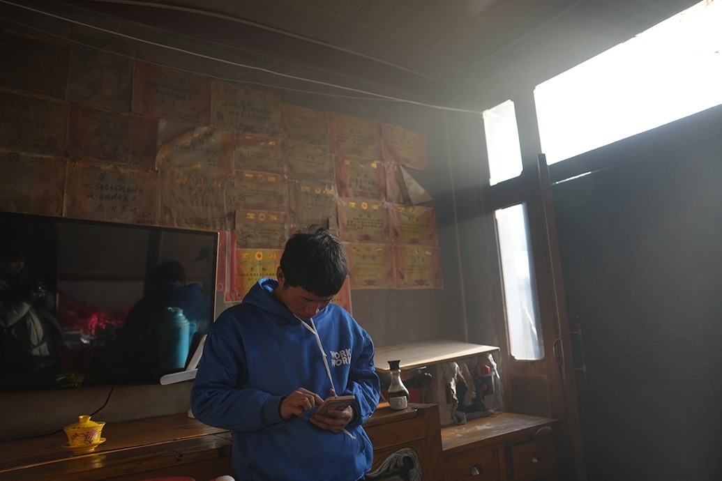 震后,他家木頭架構(gòu)的屋頂傾斜了些,磚瓦墻多處開裂,土炕也裂了,柴火的煙從裂縫滲出,有些嗆人。原則上,他家是不能再進(jìn)入了,但上課的話,房間更舒適暖和點(diǎn)。
