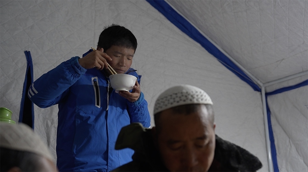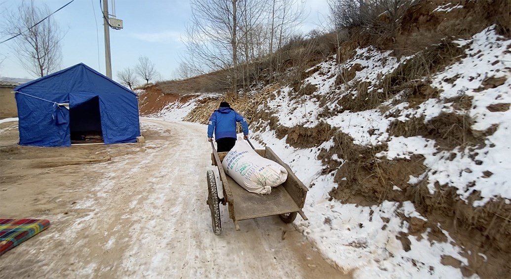 12月20日,馬國忠一家回到村里,拿塑料布在家附近搭了個簡易帳篷,兩根木頭、一條橫梁支起來,怕煙筒把塑料烤化,帳篷里不能烤火,頂多防風(fēng),但馬國忠覺得比車?yán)飶?qiáng)多了。家里的電熱毯拿出來鋪上,他才睡了個安穩(wěn)覺。只是半夜來了余震,又醒了。他止不住想:下一步怎么辦?后面會不會繼續(xù)搖?他家鋼管焊的牛棚頂晃得“乒乒乓乓”響。