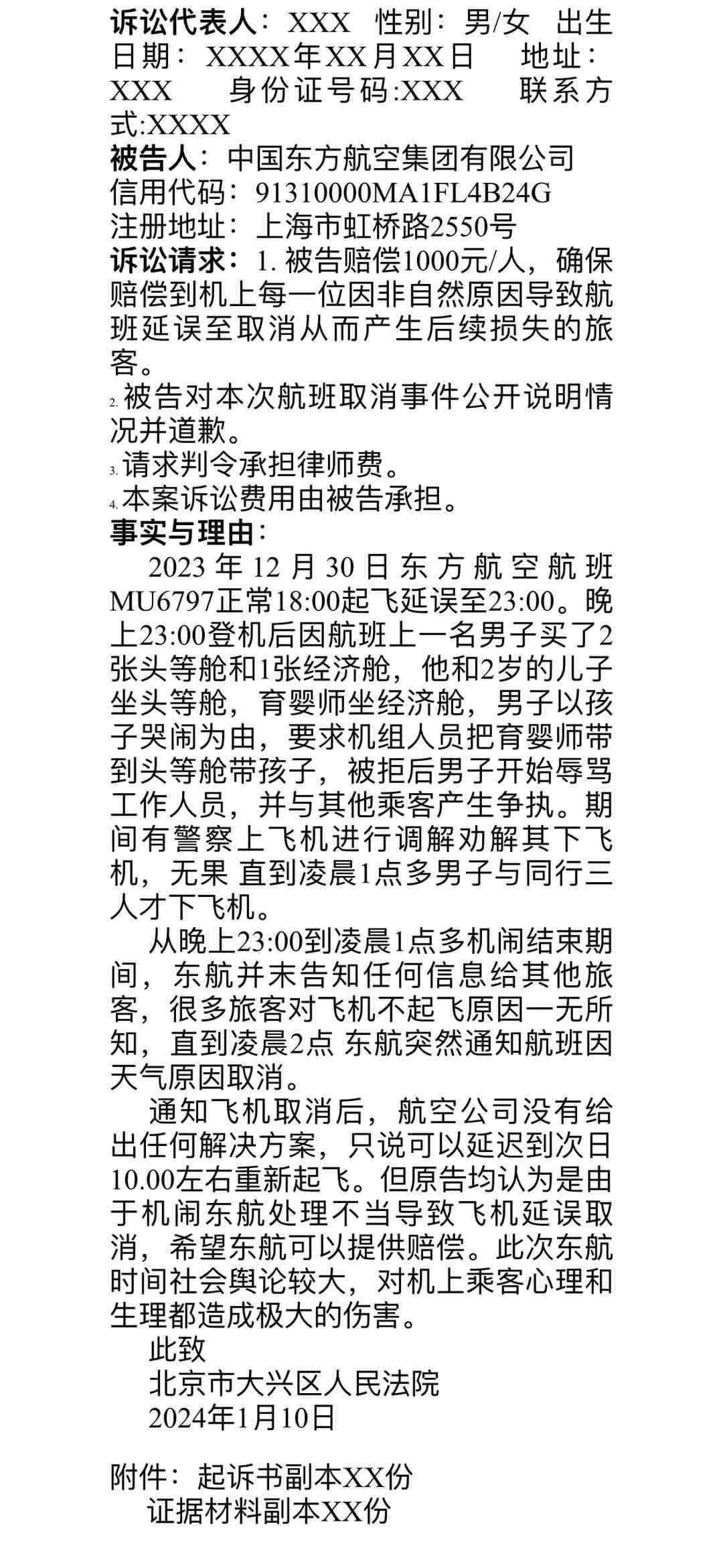 群內(nèi)發(fā)出的起訴書寫道:“從當日23點到次日凌晨1點多機鬧結(jié)束期間,東航并未告知任何信息給其他旅客,很多旅客對飛機不起飛原因一無所知,直到凌晨2點,東航突然通知航班因天氣原因取消。通知飛機取消后,航空公司沒有給出任何解決方案,只說可以延遲到次日10點左右重新起飛。但原告均認為是由于機鬧,東航處理不當,導(dǎo)致飛機延誤取消,希望東航可以提供賠償。此次東航事件社會輿論較大,對機上乘客心理和生理都造成極大的傷害?!睋?jù)悉,乘客們擬起訴至北京市大興區(qū)人民法院。