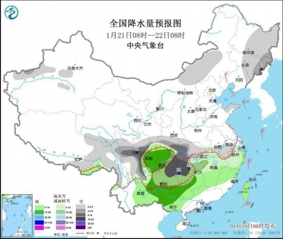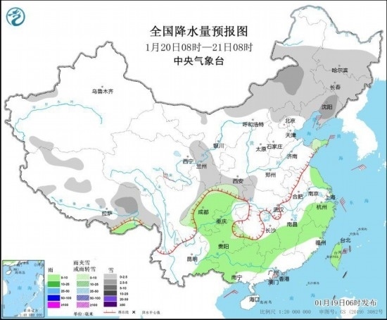 圖1 全國降水量預報圖(1月19日08時-20日08時)