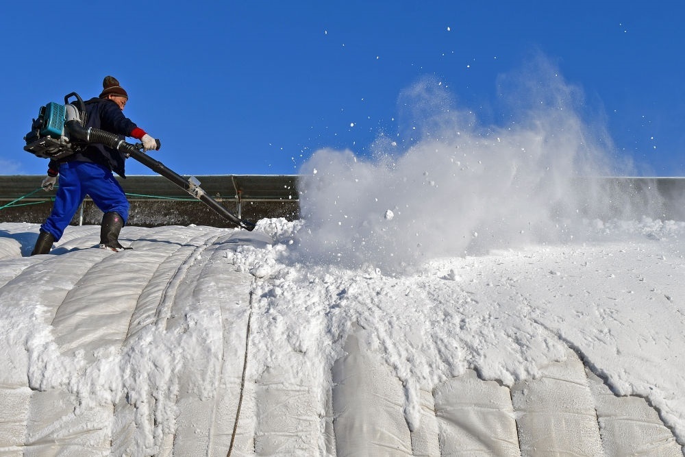 2023年12月17日,農(nóng)民在山東省煙臺(tái)市福山區(qū)門(mén)樓街道用鼓風(fēng)機(jī)清理暖棚上的積雪。新華社發(fā)(孫文潭攝)