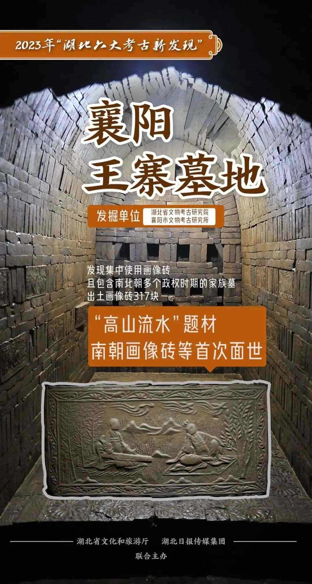 襄陽(yáng)王寨墓地,發(fā)現(xiàn)一處集中使用畫像磚且年代跨越南、北朝多個(gè)政權(quán)時(shí)期的家族墓,其中7座墓葬出土畫像磚共計(jì)317塊,涉及19種不同圖案。首次發(fā)現(xiàn)“高山流水”題材以及“五音直郎”“小輿大駕行”“牽誕馬”榜題的畫像磚。