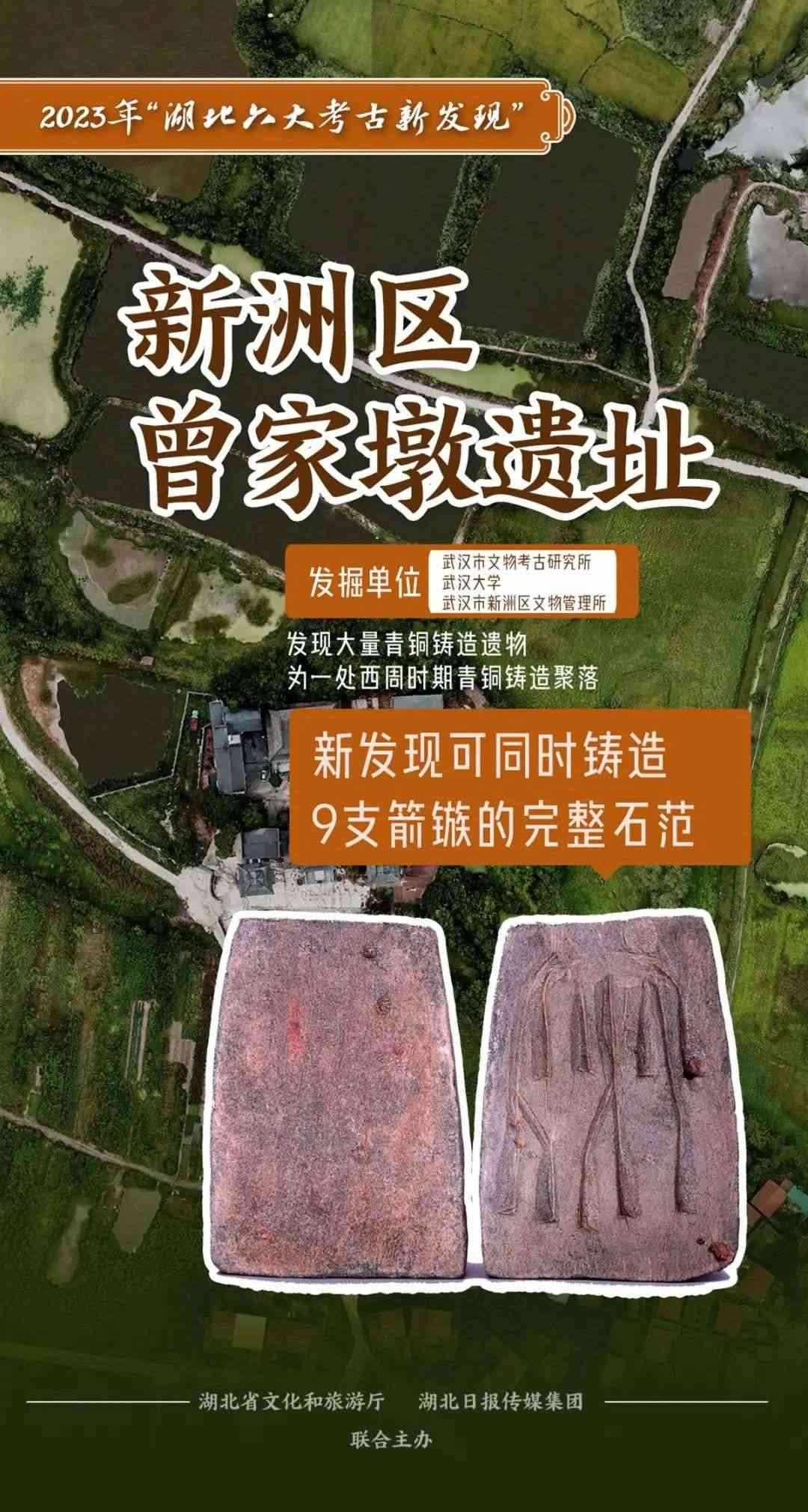 繼武漢黃陂盤龍城遺址小嘴遺址點(diǎn)、郭元咀遺址發(fā)現(xiàn)商代鑄銅遺存后,考古工作者在新洲曾家墩遺址新發(fā)現(xiàn)西周時(shí)期青銅鑄造遺存。遺址出土一塊用于鑄造青銅箭鏃的石范(即鑄造青銅器的石質(zhì)模具),保存完好,其完整程度在此前湖北地區(qū)考古中未曾發(fā)現(xiàn)。這塊石范可同時(shí)鑄造9支青銅箭鏃,具有相當(dāng)高的工藝水平。