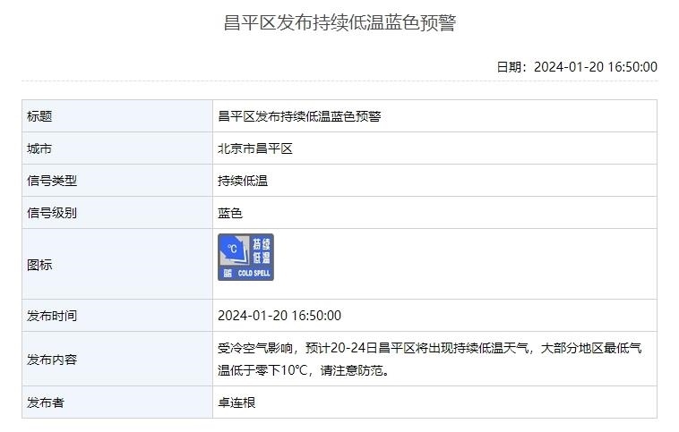 1月20日,北京延慶、懷柔、昌平3區(qū)發(fā)布持續(xù)低溫藍(lán)色預(yù)警。受冷空氣影響,預(yù)計(jì)20—24日這3個區(qū)將出現(xiàn)持續(xù)低溫天氣,其中延慶、懷柔兩地大部分地區(qū)氣溫低于零下15℃,請注意防范。