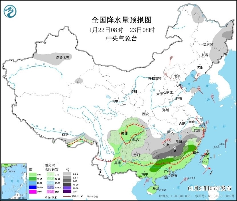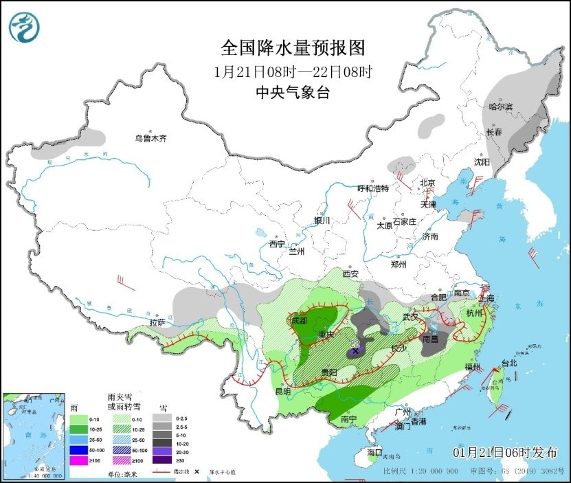 預(yù)計21日,湖北西南部、湖南中西部和北部、貴州中東部和西南部、重慶東部等地的部分地區(qū)有大到暴雪,其中,湖南西部、貴州東北部等地的部分地區(qū)有大暴雪(20~22毫米)。上述部分地區(qū)新增積雪深度3~8厘米,局地可達10厘米以上。此外,貴州、湖南西部和南部、廣西北部、廣東北部等地局地有凍雨。