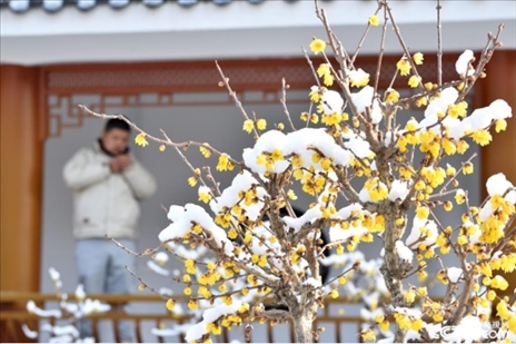 2024年1月22日,一場大雪過后,湖北省襄陽市保康縣蠟梅公園內(nèi)的蠟梅傲雪綻放,黃色的蠟梅和白色的積雪相映成趣,美不勝收。