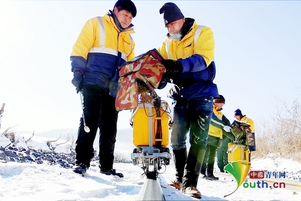 兩臺超聲波鋼軌探傷儀,在身穿橙黃色工作服的探傷工的推行下,緩緩向線路遠(yuǎn)方走去。寒風(fēng)中,探傷工們從頭到腳的防寒裝備也為他們在冬季室外作業(yè)提供了保障。