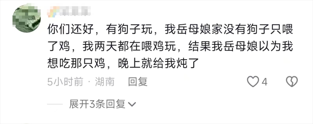 有的網(wǎng)友為了防止丈人家的狗不陪自己玩,干脆自己帶了一只狗去擼,而那些沒(méi)有狗玩的女婿就比較落寞了,只能找些小雞小豬聊聊天。