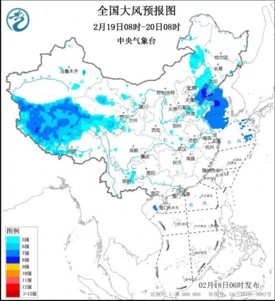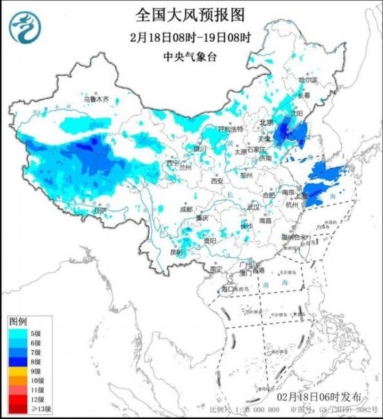 2月18日8時(shí)至19日8時(shí),新疆南疆盆地東部、西藏中西部、青海南部、甘肅河西、內(nèi)蒙古中西部、遼寧中西部等地將有5~6級、陣風(fēng)7~8級的大風(fēng);渤海、渤海海峽、黃海北部海域、東海北部海域?qū)⒂?~8級、陣風(fēng)9~10級的大風(fēng)。2月19日8時(shí)至20日8時(shí),西藏中西部、青海南部、甘肅河西、內(nèi)蒙古中東部、遼寧西部和南部等地將有5~6級、陣風(fēng)7~8級的大風(fēng);渤海、渤海海峽、黃海大部海域?qū)⒂?~8級、陣風(fēng)9~10級的大風(fēng)。中央氣象臺(tái)2月18日6時(shí)繼續(xù)發(fā)布大風(fēng)藍(lán)色預(yù)警。