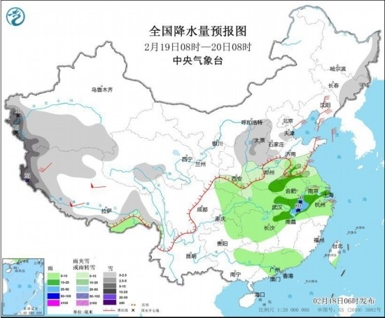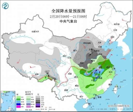 2月20日8時(shí)至21日8時(shí),內(nèi)蒙古中西部、新疆南部、青藏高原大部、西北地區(qū)東部、華北、黃淮等地部分地區(qū)有小到中雪或雨夾雪,其中,陜西南部、華北南部、黃淮中西部、湖北北部等地部分地區(qū)有大到暴雪(10~18毫米)。江淮大部、江漢東部、江南北部、重慶東北部等地部分地區(qū)有中到大雨,局地有暴雨(50~85毫米)。內(nèi)蒙古西部、陜西北部、遼東半島、山東半島、江蘇南部、浙江中部等地部分地區(qū)有4~6級風(fēng)。渤海、黃海大部海域有7~8級風(fēng),陣風(fēng)9級。