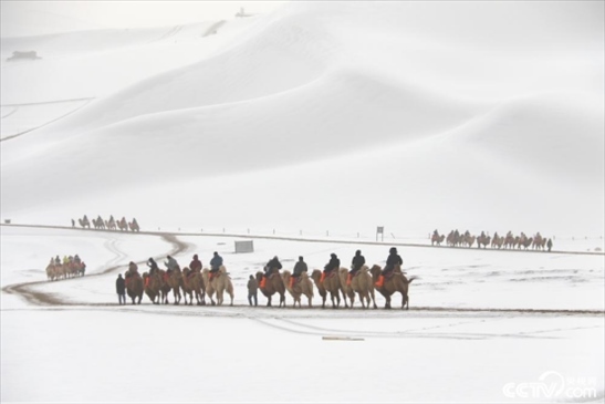 2024年2月18日,甘肅酒泉,游客在敦煌市鳴沙山月牙泉景區(qū)游覽。雪后的甘肅省敦煌市鳴沙山月牙泉景區(qū)銀裝素裹,景色如畫(huà),游客徜徉其中,欣賞大漠雪景,體驗(yàn)絲路風(fēng)情。