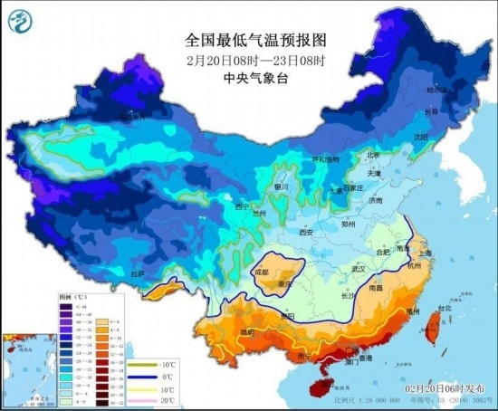 中新網2月20日電 據(jù)中央氣象臺網站消息,中央氣象臺2月20日6時繼續(xù)發(fā)布寒潮橙色預警:受寒潮影響,預計,2月20日至2月23日,我國中東部大部將自北向南先后出現(xiàn)降溫,日平均或最低氣溫普遍下降8~12℃,華北南部、黃淮西部、江淮、江漢、江南、華南中北部及貴州等地氣溫將下降12~18℃,其中,湖南南部、貴州東部、廣西北部等地的部分地區(qū)累計降溫幅度可達20℃以上。2月23日前后,最低溫度0℃線將南壓到蘇皖南部至湖南南部、貴州南部一帶。