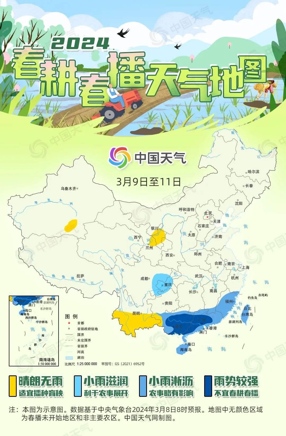 “微雨眾卉新,一雷驚蟄始。田家?guī)兹臻e,耕種從此起。”到了驚蟄時(shí)節(jié),我國春耕春播工作已陸續(xù)展開,從華南到西北,田間地頭逐漸忙碌了起來。一年之計(jì)在于春,春耕春播工作對(duì)于全年糧食豐收至關(guān)重要。中國天氣網(wǎng)推出2024全國春播進(jìn)程圖和春耕春播天氣地圖,看各地春播何時(shí)展開,近期春播天氣如何。