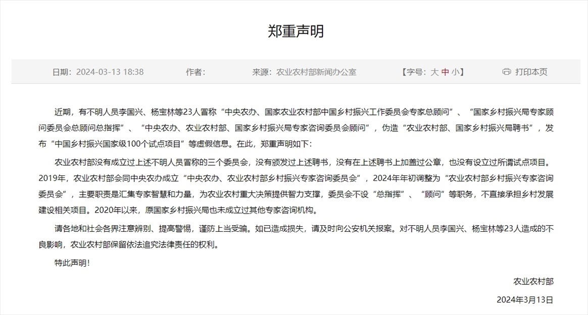 ·農(nóng)業(yè)農(nóng)村部鄭重聲明:沒有成立過不明人員冒稱的“中央農(nóng)辦、國家農(nóng)業(yè)農(nóng)村部中國鄉(xiāng)村振興工作委員會(huì)專家總顧問”、“國家鄉(xiāng)村振興局專家顧問委員會(huì)總顧問總指揮”、“中央農(nóng)辦、農(nóng)業(yè)農(nóng)村部、國家鄉(xiāng)村振興局專家咨詢委員會(huì)顧問”三個(gè)委員會(huì),沒有頒發(fā)過上述聘書,沒有在上述聘書上加蓋過公章,也沒有設(shè)立過所謂試點(diǎn)項(xiàng)目。