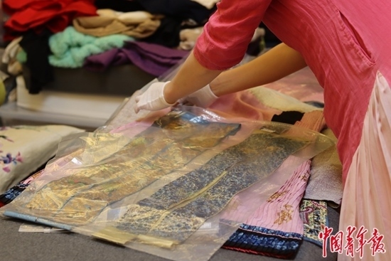 工作人員整理畢紅珍藏的清代宮廷服裝和繡品。中青報(bào)·中青網(wǎng)記者 余冰玥/攝