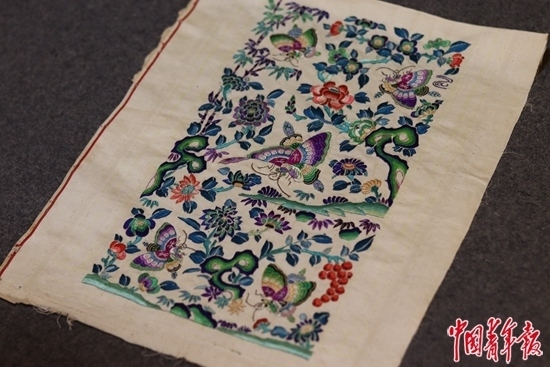 畢紅珍藏的清代宮廷繡品,鳳蝶寓意“喜相逢”。中青報(bào)·中青網(wǎng)記者 余冰玥/攝