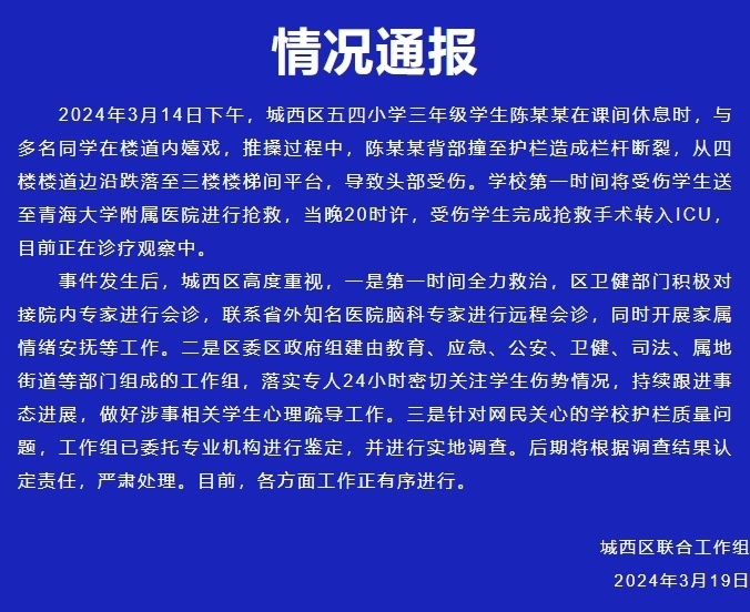 央視網(wǎng)消息:據(jù)“魅力西區(qū)”微信公眾號(hào)消息,城西區(qū)聯(lián)合工作組通報(bào),3月14日下午,城西區(qū)五四小學(xué)三年級(jí)學(xué)生陳某某在課間休息時(shí),與多名同學(xué)在樓道內(nèi)嬉戲,推搡過程中,陳某某背部撞至護(hù)欄造成欄桿斷裂,從四樓樓道邊沿跌落至三樓樓梯間平臺(tái),導(dǎo)致頭部受傷。學(xué)校第一時(shí)間將受傷學(xué)生送至青海大學(xué)附屬醫(yī)院進(jìn)行搶救,當(dāng)晚20時(shí)許,受傷學(xué)生完成搶救手術(shù)轉(zhuǎn)入ICU,目前正在診療觀察中。