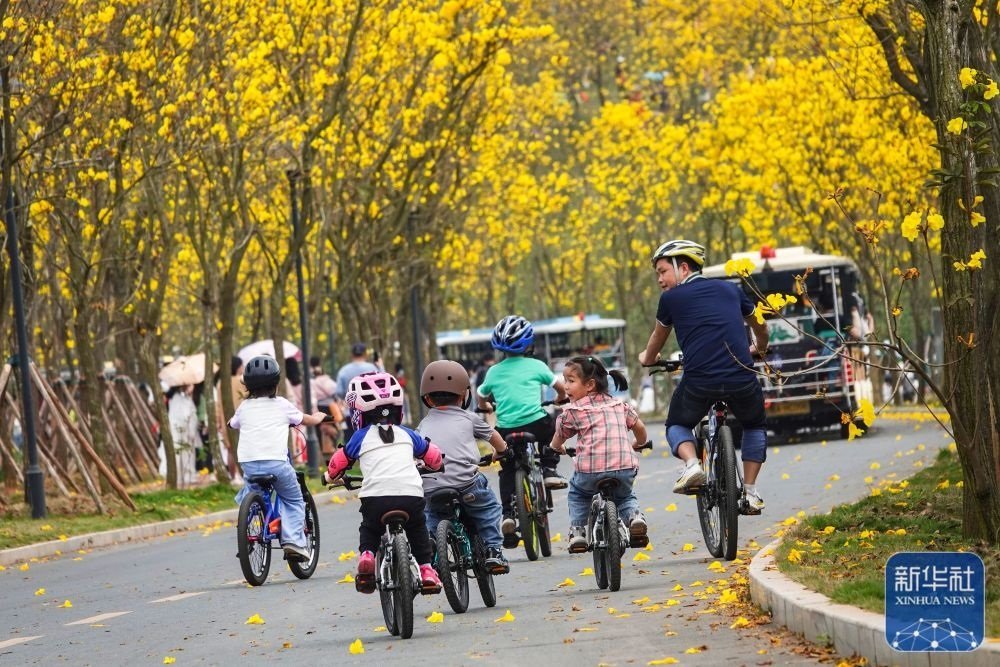 3月23日,在廣西南寧市青秀山景區(qū)風(fēng)鈴谷,游人騎自行車在黃花風(fēng)鈴木花海長(zhǎng)廊暢游。新華社發(fā)(喻湘泉攝)