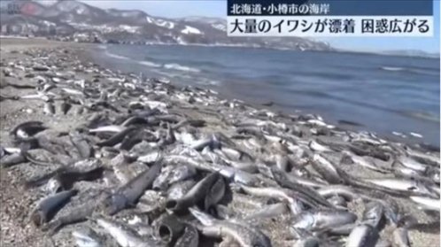 ·日本一海灘現(xiàn)沙丁魚尸體綿延7公里,當(dāng)?shù)卣粲蹙用癫灰|碰死魚。