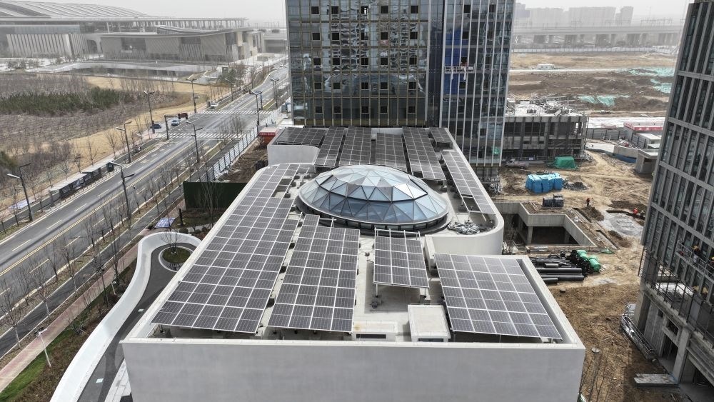 ↑雄安自貿(mào)試驗區(qū)交流展示中心是首批通過新區(qū)專家評審的零碳示范建筑,這是該中心屋頂?shù)墓夥l(fā)電設(shè)施(3月28日攝,無人機照片)。