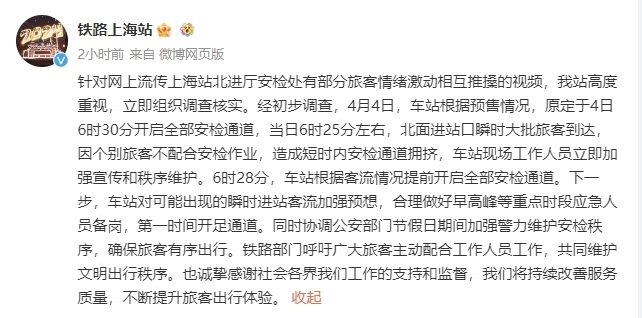 央視網(wǎng)消息:據(jù)@鐵路上海站 消息,針對網(wǎng)上流傳上海站北進廳安檢處有部分旅客情緒激動相互推搡的視頻,車站高度重視,立即組織調(diào)查核實。經(jīng)初步調(diào)查,4月4日,車站根據(jù)預(yù)售情況,原定于4日6時30分開啟全部安檢通道,當(dāng)日6時25分左右,北面進站口瞬時大批旅客到達,因個別旅客不配合安檢作業(yè),造成短時內(nèi)安檢通道擁擠,車站現(xiàn)場工作人員立即加強宣傳和秩序維護。6時28分,車站根據(jù)客流情況提前開啟全部安檢通道。下一步,車站對可能出現(xiàn)的瞬時進站客流加強預(yù)想,合理做好早高峰等重點時段應(yīng)急人員備崗,第一時間開足通道。同時協(xié)調(diào)公安部門節(jié)假日期間加強警力維護安檢秩序,確保旅客有序出行。鐵路部門呼吁廣大旅客主動配合工作人員工作,共同維護文明出行秩序,也誠摯感謝社會各界對其工作的支持和監(jiān)督,將持續(xù)改善服務(wù)質(zhì)量,不斷提升旅客出行體驗。
