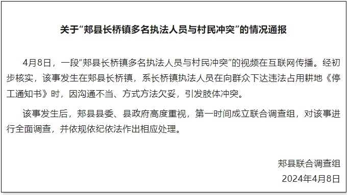 央視網消息:據“郟縣發(fā)布”公眾號消息,河南省平頂山市郟縣聯合調查組發(fā)布情況通報,4月8日,一段“郟縣長橋鎮(zhèn)多名執(zhí)法人員與村民沖突”的視頻在互聯網傳播。經初步核實,該事發(fā)生在郟縣長橋鎮(zhèn),系長橋鎮(zhèn)執(zhí)法人員在向群眾下達違法占用耕地《停工通知書》時,因溝通不當、方式方法欠妥,引發(fā)肢體沖突。