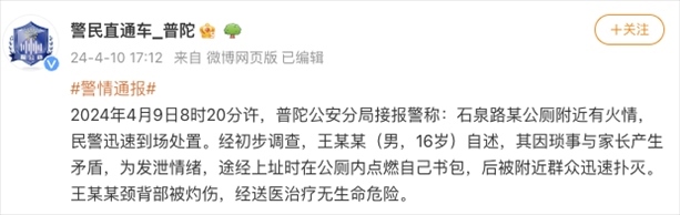 央視網(wǎng)消息:據(jù)@警民直通車(chē)_普陀 微博消息,4月9日8時(shí)20分許,上海普陀公安分局接報(bào)警稱(chēng):石泉路某公廁附近有火情,民警迅速到場(chǎng)處置。經(jīng)初步調(diào)查,王某某(男,16歲)自述,其因瑣事與家長(zhǎng)產(chǎn)生矛盾,為發(fā)泄情緒,途經(jīng)上址時(shí)在公廁內(nèi)點(diǎn)燃自己書(shū)包,后被附近群眾迅速撲滅。王某某頸背部被灼傷,經(jīng)送醫(yī)治療無(wú)生命危險(xiǎn)。
