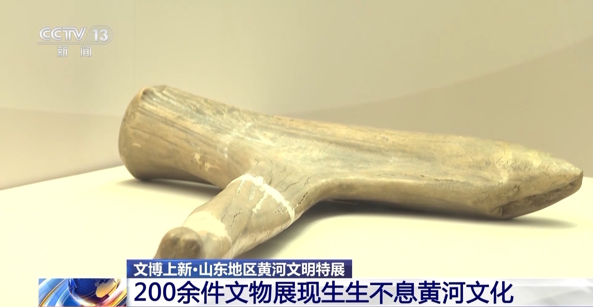 濟(jì)南市博物館陳列展覽部策展人 于筱箏:它是新石器時(shí)代大汶口文化時(shí)期的一件鹿角鋤,它的一面比較圓鈍,可以用來敲擊比較堅(jiān)硬的物品,比如土塊、石頭等等。另一面比較尖銳,就可以用來刨、镢、刨坑松土。
