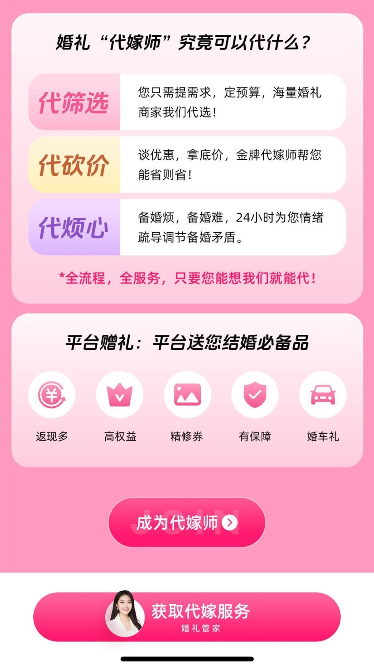 該頁(yè)面還宣傳稱(chēng),代嫁師可以“代篩選”“代砍價(jià)”“代煩心”,并且還有一行字強(qiáng)調(diào):“全流程,全服務(wù),只要您能想,代嫁師就能代。”