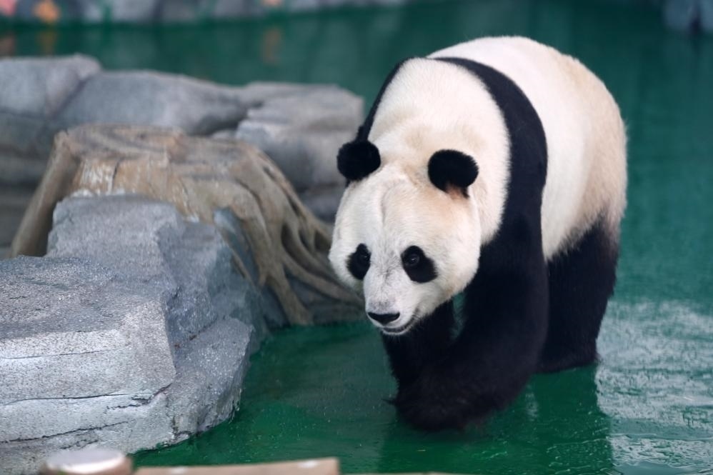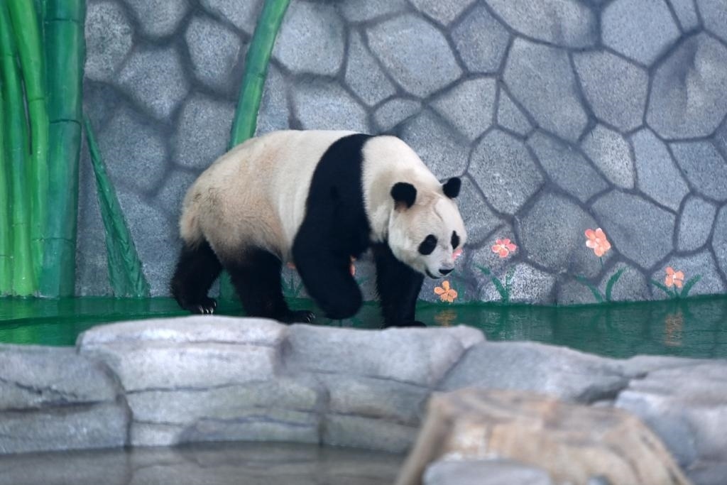 繼續(xù)前行進(jìn)入大熊貓2號館,便能看到園內(nèi)唯一的雌性大熊貓“曼蘭”。今年7歲的它“兩耳不聞窗外事”,疾步快走,不停地在館舍內(nèi)繞圈子。住在它隔壁的6歲雄性大熊貓“滿滿”則鏡頭感十足,當(dāng)游客拿出手機(jī)拍攝時(shí),它趴在地上吐舌頭“賣萌”,不一會又變換姿勢,攀上木樁玩耍,吸引眾多游客紛紛按下快門,記錄它活潑可愛的一面。