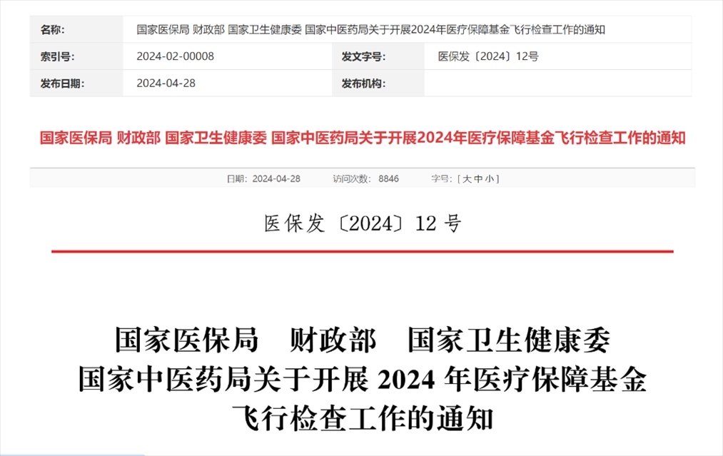 這項《關于開展2024年醫(yī)療保障基金飛行檢查工作的通知》由國家醫(yī)保局、財政部、國家衛(wèi)生健康委、國家中醫(yī)藥局聯(lián)合印發(fā)。
