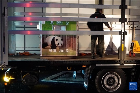 4月29日,在西班牙馬德里,工作人員轉運大熊貓“金喜”。新華社發(fā)(西班牙馬德里動物園供圖)