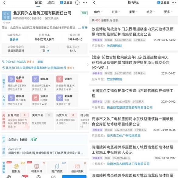 企查查信息顯示,北京同興古建筑工程有限責(zé)任公司成立于1999年,法定代表人為徐長林。招投標(biāo)信息顯示,該公司先后中標(biāo)全國多地文保單位修繕工程,其中包含故宮博物院、全國重點文保單位天峰山古建筑群、原齊魯大學(xué)近現(xiàn)代建筑群等。