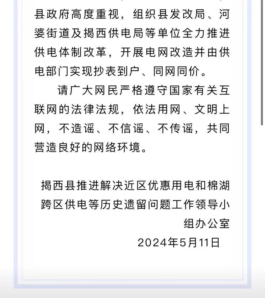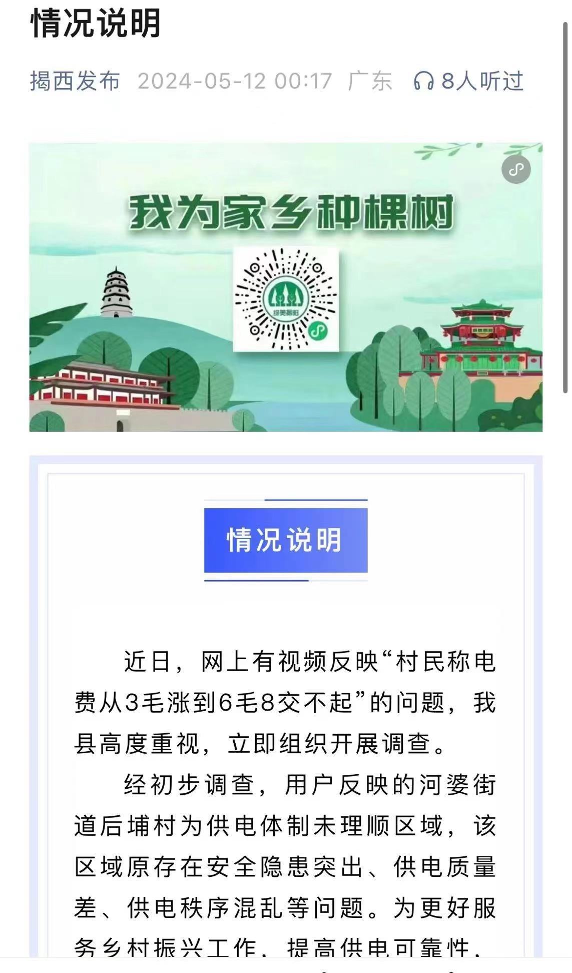 針對(duì)此事,“揭西發(fā)布”微信公眾號(hào)于5月12日發(fā)布了情況說(shuō)明,表示對(duì)網(wǎng)上反映的“村民稱電費(fèi)從3毛漲到6毛8交不起”的問(wèn)題高度重視,并已立即開(kāi)展調(diào)查。