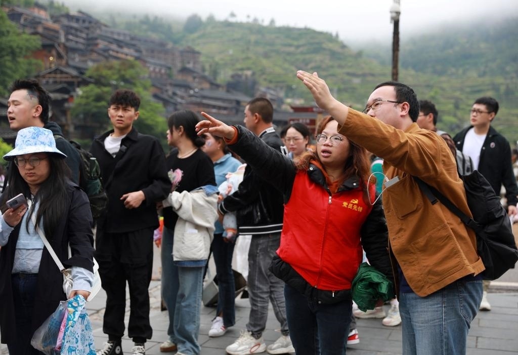 5月3日,黨員志愿者在貴州省黔東南苗族侗族自治州雷山縣西江千戶(hù)苗寨景區(qū)為游客指路。新華社發(fā)(吳賢燕 攝)