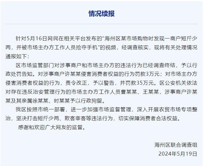 央視網(wǎng)消息:據(jù)“今日海州”微信公眾號消息,針對5月16日網(wǎng)民在相關(guān)平臺發(fā)布的“海州區(qū)某市場購物時發(fā)現(xiàn)一商戶短斤少兩,并被市場主辦方工作人員搶奪手機”的視頻,經(jīng)調(diào)查核實,現(xiàn)將有關(guān)處理情況通報如下:區(qū)市場監(jiān)管部門對涉事商戶和市場主辦方的違法行為已經(jīng)調(diào)查終結(jié),予以行政處罰告知。對涉事商戶許某某侵害消費者權(quán)益的行為罰款3萬元;對市場主辦方侵害消費者權(quán)益的行為,責令改正,予以警告,并罰款35萬元。區(qū)公安機關(guān)依法對存在違反治安管理行為的市場主辦方工作人員曹某某、王某某,涉事商戶許某某及其親屬徐某某、時某某予以行政拘留。